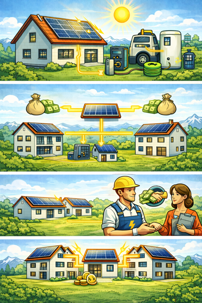 Die Solaranlage wird zentral betrieben, und der produzierte Strom wird innerhalb der Gemeinschaft verteilt. Jede Partei erhält eine eigene Abrechnung für den selbst genutzten Solarstrom und bezieht nur den restlichen Strom aus dem öffentlichen Netz.