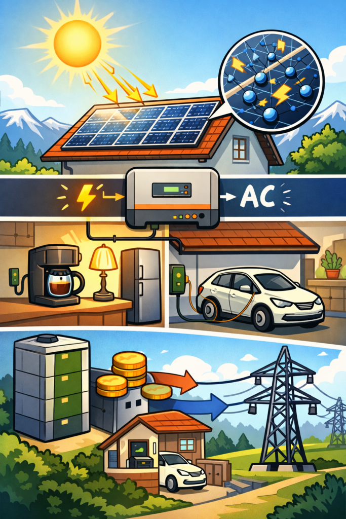 Damit dieser Strom im Haushalt genutzt werden kann, übernimmt ein Wechselrichter die Umwandlung in Wechselstrom. Erst danach kann der Solarstrom ganz normal für Licht, Haushaltgeräte oder das Laden eines E-Autos verwendet werden.